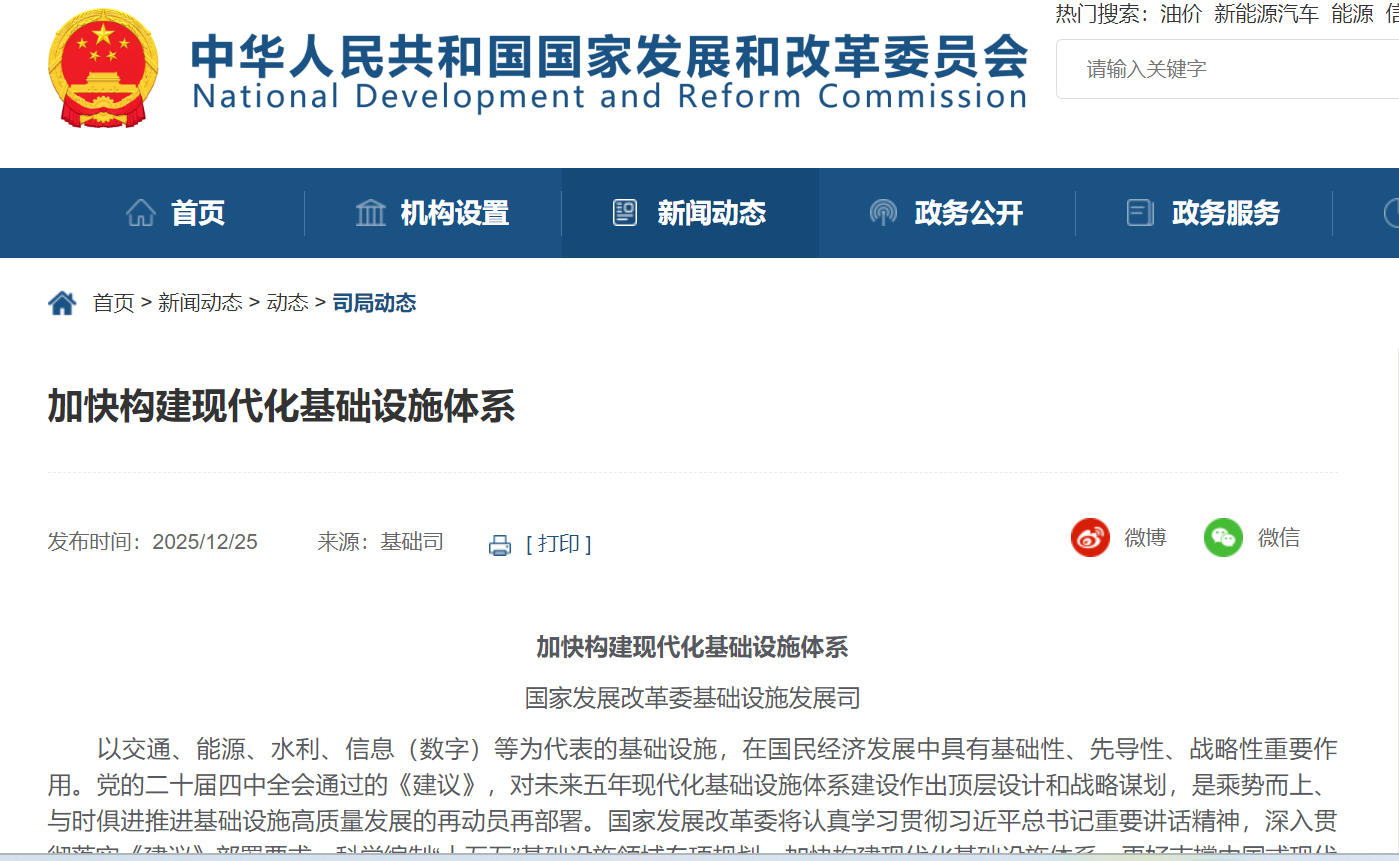 12月25日,国家发改委官网发布文章《加快构建现代化基础设施体系》,其中明确,扎实推进“十五五”现代化基础设施体系建设,深化综合交通运输体系改革,加强空管体制改革;有序发展低空经济、枢纽经济、通道经济,培育邮轮游艇、汽车营地等体验经济。
